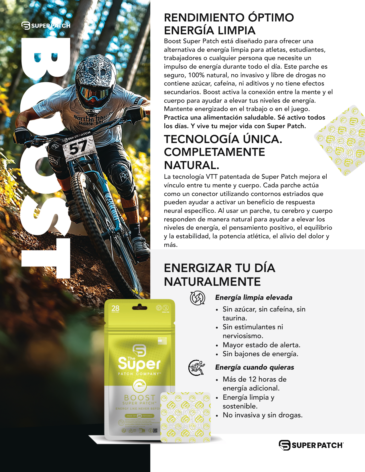 Con Boost Super Patch, tendrás la energía que necesitas para superar los desafíos del día con intensidad y resistencia. ¡Experimenta la revolución de la energía limpia y lleva tu rendimiento al siguiente nivel!